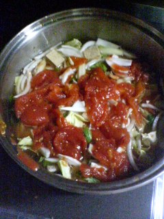 ②切り終わったら鍋に野菜をいれて、ホールトマトを潰しながら入れる。