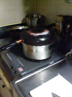 しょうがないので手ごろなフライパンを蓋のかわりにして、強火でコトコト。